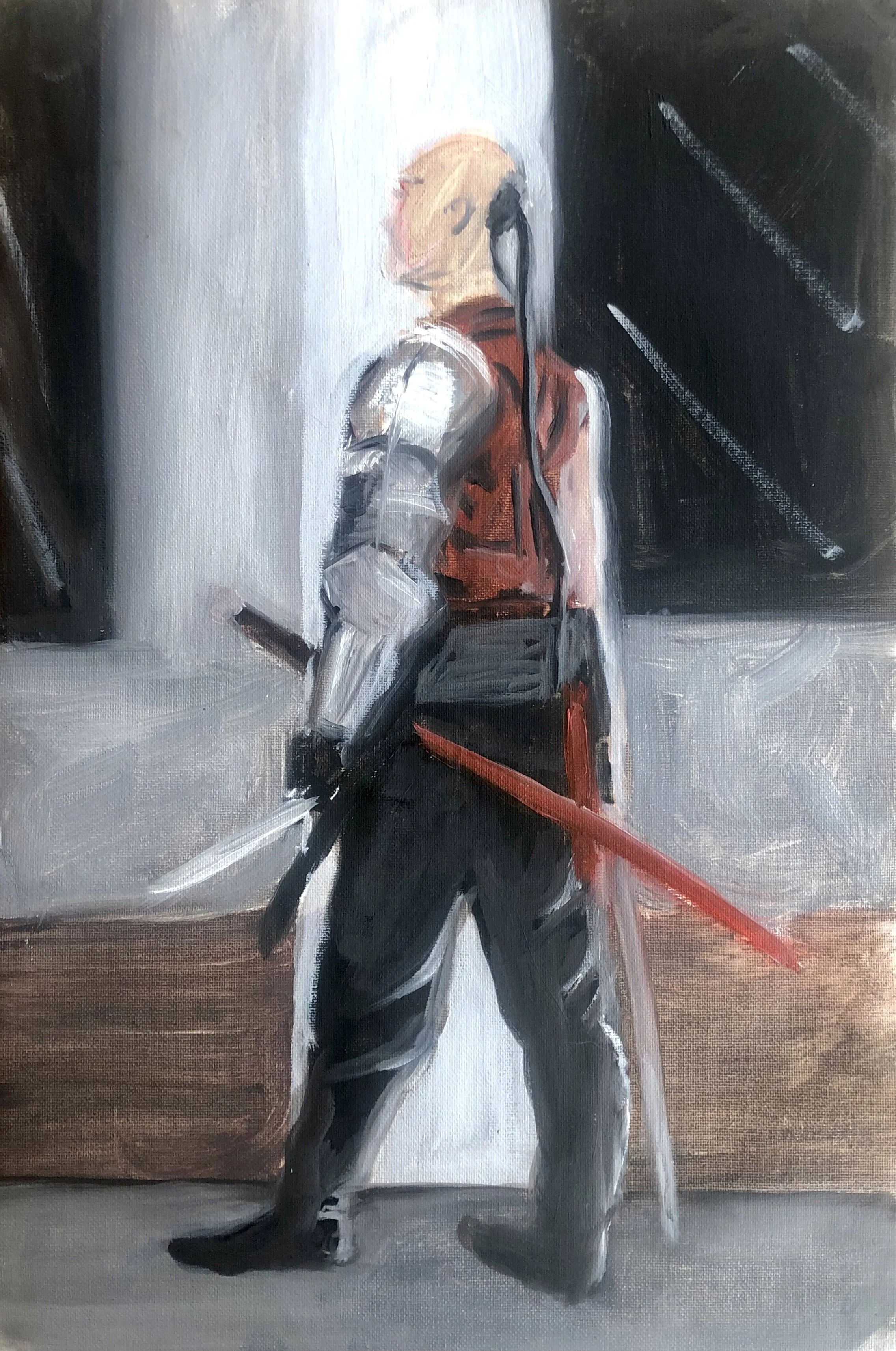 12” x 18” . Oil paint on raw canvas . A practice painting depicting a model dressed in partial armor.